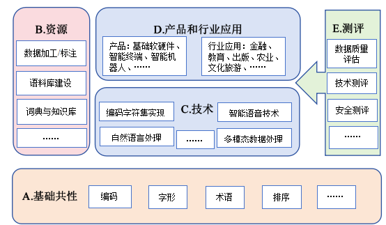 以产品实现过程涉及的关键要素和相互关系为依据,将藏语言文字信息技术标准体系分为五类标准,包括:A.基础共性类标准、B.资源标准、C.技术标准、D.产品与应用标准和E.测评标准五个部分。如下图所示。